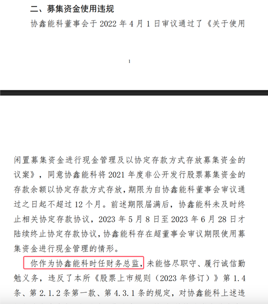 四是协鑫能科在《2022年半年度募集资金存放与使用情况的专项报告》《2023年度募集资金存放与使用情况的专项报告》和《2024年半年度募集资金存放与使用情况的专项报告》中存在信息披露不准确的问题,相关行为违反了《信披办法》第三条第一款和《2号指引》第十二条第一款的相关规定。时任财务总监生育新、财务总监彭毅,应当对上述违规行为负有主要责任。
