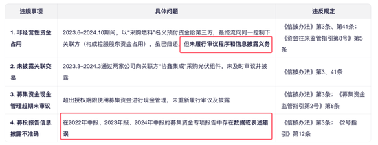 一是2023年6月至2024年10月期间,协鑫能源科技股份有限公司(以下简称协鑫能科)以采购燃料方式向第三方支付采购预付款,资金最终流入协鑫能科同一控制下关联方,构成控股股东非经营性资金占用,相关款项已经归还。上述关联交易未及时履行审议程序和信息披露义务,违反了《上市公司信息披露管理办法》(证监会令第182号,以下简称《信披办法》)第三条第一款、《上市公司监管指引第8号——上市公司资金往来、对外担保的监管要求》(证监会公告〔2022〕26号)第五条第二项的规定。实际控制人朱共山主导了非经营性资金占用,规避上市公司的关联交易审议程序和信息披露义务,违反了《信披办法》第四十一条的规定。董事长朱钰峰,副董事长、时任董事会秘书费智,董事会秘书杨而立,时任财务总监生育新,财务总监彭毅,未能勤勉尽责,应当对上述违规行为负有主要责任。