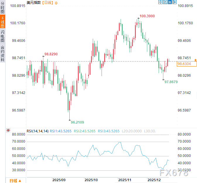 美元2026年走势将是“美联储政策路径”与“其他主要央行政策路径”之间相对优势的较量。美国经济因AI可能更具韧性,通胀更具粘性,这为美联储提供了比其他央行更晚、更慢宽松的余地。这一相对优势,是当前环境下支撑美元的最主要逻辑。然而,政治干预风险和内部政策分歧是这一逻辑面临的最大威胁。周一亚市时段,美元指数于98.65附近窄幅震荡。